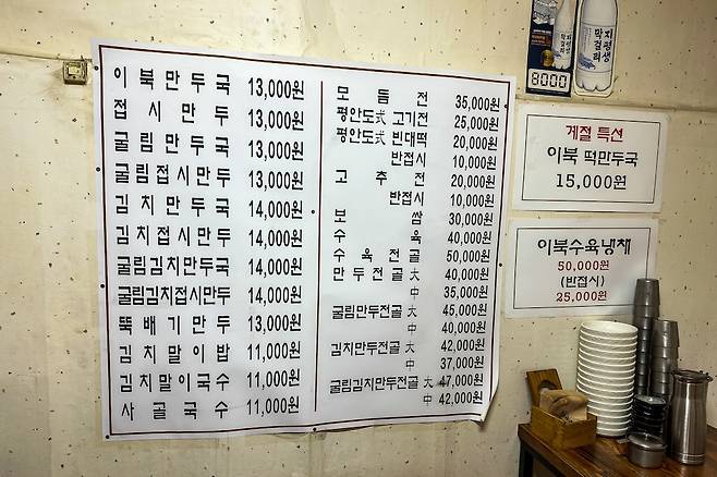 어렵게 찾아가 자리를 잡고 기본인 이북만두국을 주문했다. 가격은 다른 평안도식 만둣국답게 저렴하지는 않다. 희한하게 평양냉면도 비슷한 가격구조를 가지는데 이북 프리미엄인가? 하여간 전체적으로 가게는 외형은 무척 낡았지만, 내부 느낌은 깔끔하게 관리가 잘된다는 느낌이다.