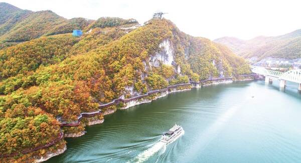 남한강 절벽 20m 위에 조성된 나무 산책로인 단양강잔도는 약 1.1km의 길이로 부담없이 가을 산책을 즐기기 좋은 단양 단풍 명소입니다. 산책로 한 켠으로는 깎아지른듯한 암벽이 펼쳐져 자연의 웅장함을 느껴볼 수 있는데요. 암벽 사이 뿌리를 내린 나무에 화려한 단풍이 들어 마치 한 폭의 수채화 속으로 들어온 듯한 착각이 듭니다.