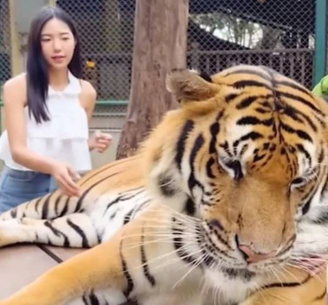 사연은 이렇습니다. SNS상에는 사진을 찍으려고 휴식을 취하고 있는 호랑이에게 다가가 손을 뻗어서 배를 문지르는 여성 모습이 담긴 영상이 올라왔죠.