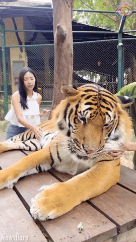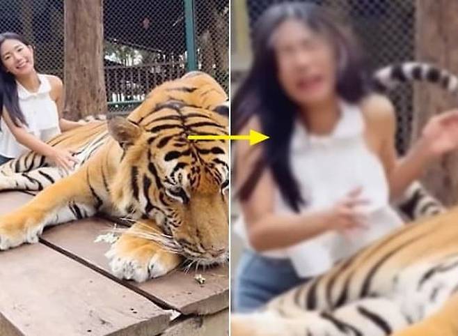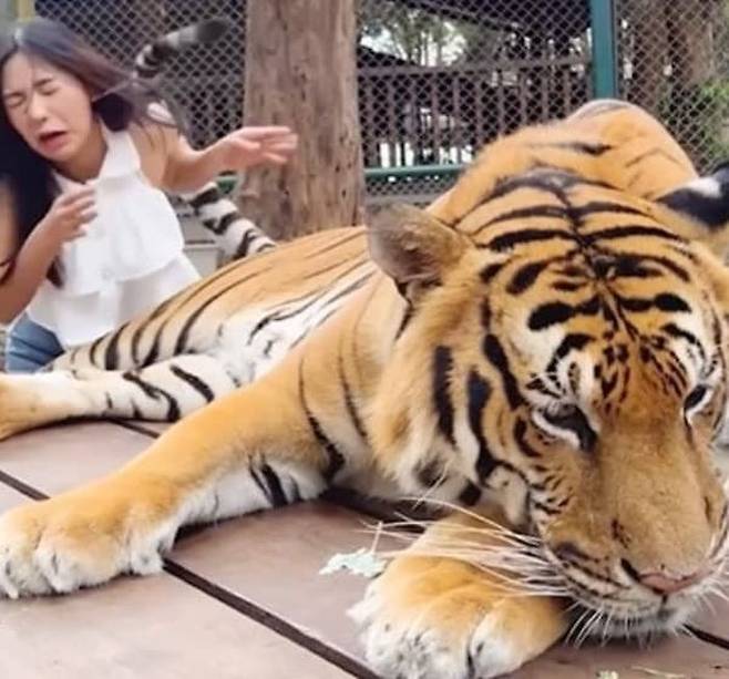 태국 동물원에서 촬영된 것으로 알려진 영상 속에서 여성은 사진을 찍기 위해 겁도 없이 호랑이의 배에 손을 뻗어 쓰담쓰담하기 시작했습니다.