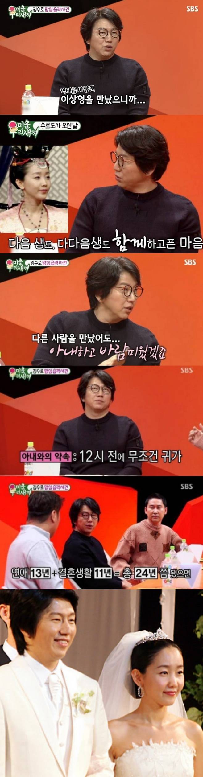 사회는 감우성이, 축가는 조성모가 맡아 특별함을 더했다. 이 부부가 단순히 사이가 좋다는 말로 설명되지 않는 이유가 있다. 김수로는 개신교인 아내를 위해 불교에서 종교까지 바꿨다.
