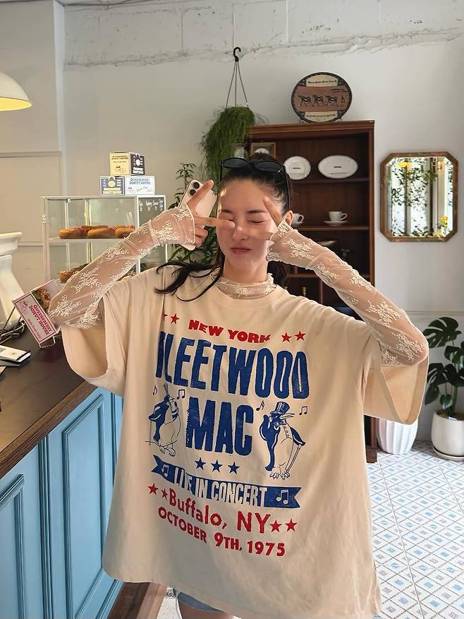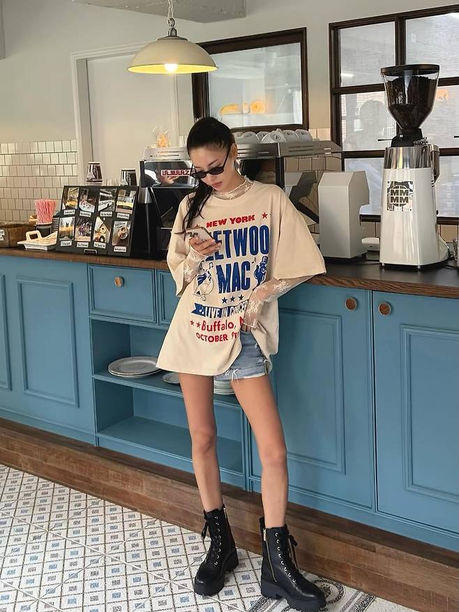 특히 티셔츠 안에 레이어드한 시스루 상의와 투박한 워커는 그녀의 가녀린 몸매를 더욱 돋보이게 하는 반전 매력을 더했습니다.