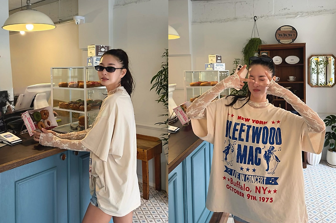 사진 속 김윤지는 박시한 오버핏 티셔츠에 짧은 데님 팬츠를 매치하여 과감한 '하의 실종' 패션을 완벽하게 선보이고 있었습니다.