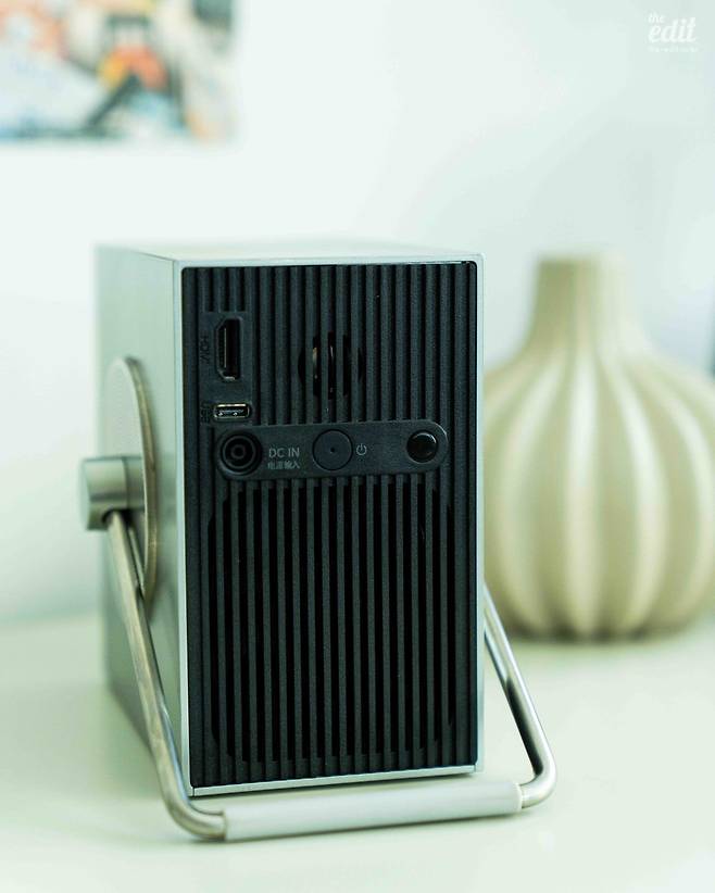 디테일을 들여다보면 간결한 디자인을 완성하기 위한 LG의 고심이 느껴진다. 360도 회전하는 손잡이는 각도를 조절하는 거치대 역할을 겸하고, 본체와 손잡이를 연결하는 좌우 경첩 부분은 스피커를 겸한다. 전원 버튼과 HDMI, USB-C 포트, DC IN 전원 단자는 전부 후면에 배치되어 깔끔하다.