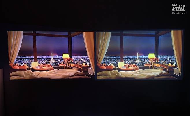 비교를 위해 1,500 안시 루멘의 4K 빔프로젝터 ‘시네빔 HU70LS’와 같은 영상을 나란히 투사해 봤다. 당연히 HU70LS가 더 밝고 선명하게 표현되지만, 3배 차이를 실감할 정도로 밝기 차이가 심하지는 않았다. 빛이 완전히 차단된 환경에서는 밝기 차이가 거의 느껴지지 않았고, 오히려 명암비가 높은 시네빔 큐브가 더 쨍하고 채도가 높게 느껴지기도 했다.