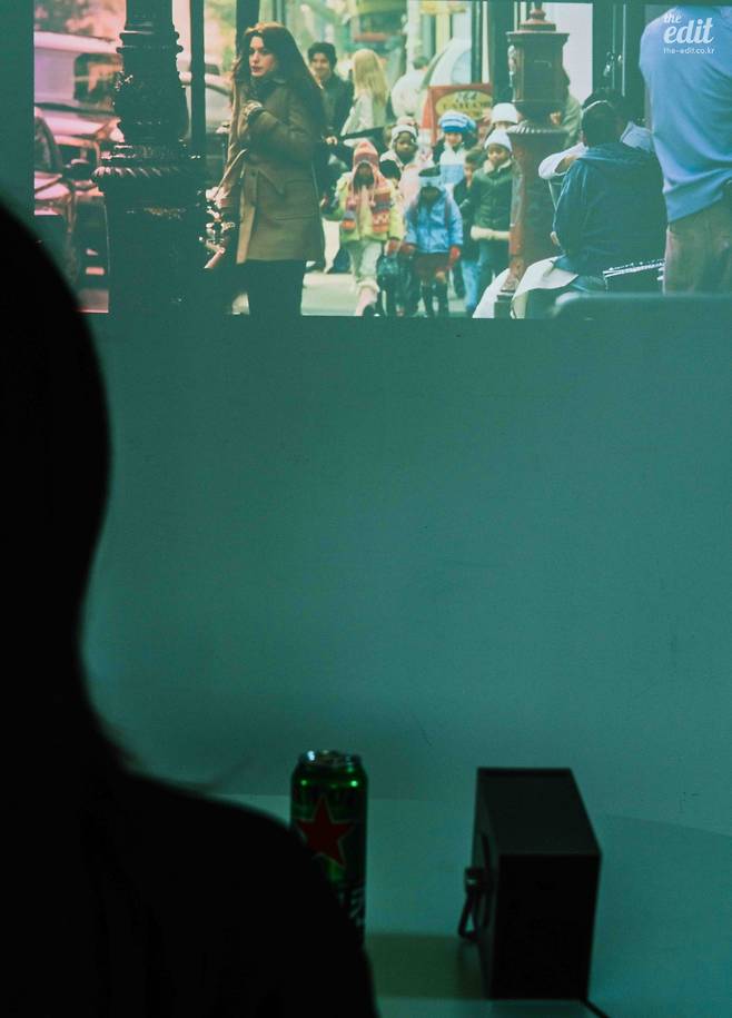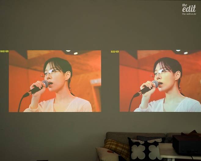 해가 진 후 깜깜한 환경에서 투사해 보니 그제야 색 재현력의 진가를 실감했다. 아이유의 ‘Celebrity’ 뮤직비디오를 감상했는데, 아이유가 입은 분홍색 드레스와 민트색 문의 색감이 화사하게 구현됐다. 물론 TV를 완벽히 대체해 낮에 영상을 보는 용도로 쓰기엔 무리가 있겠지만, 주로 퇴근 후에 영상을 보거나 암막 환경을 조성할 수 있다면 시네빔 큐브는 좋은 선택이 될 것이다.
