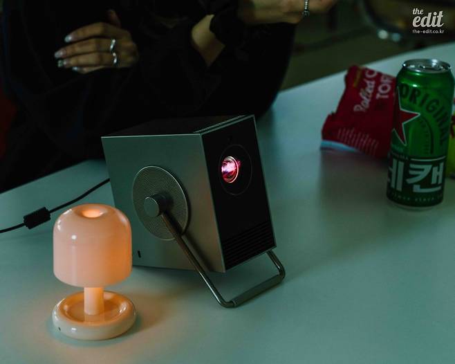 기존 빔프로젝터에도 검은색, 은색 등 다양한 컬러가 있지만 대부분은 흰색 플라스틱 소재를 쓰고 모서리는 둥근 곡선으로 마감한다. 마치 가정용 프린터 같은 생김새다. ‘인테리어를 해치지 않는 무난함’이 기존 디자인의 관건이었다면, 시네빔 큐브는 그 자체로 오브제 역할을 한다.