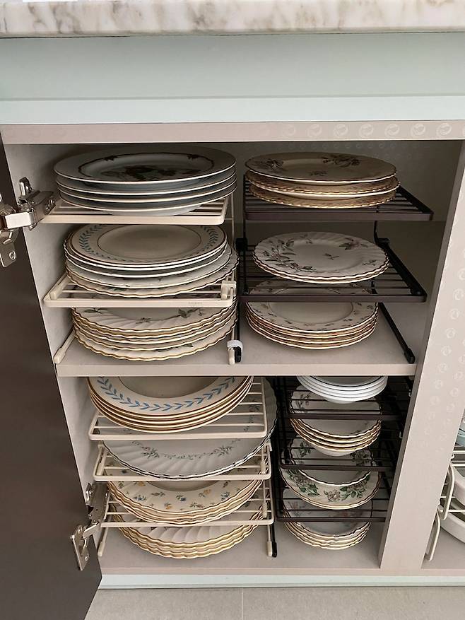 왼쪽 칸은 3P 짜리 정리대로 접시 사이즈별, 디자인별로 수납 중이에요.