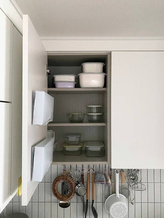 제일 왼쪽은 여러 가지 반찬통들을 보관 중이고 문에는 '실리쿡 픽미 정리함'에 비닐봉지를 넣어 부착해 주었어요. 문에 픽미를 부착할 때는 싱크대 안쪽 내용물들이랑 부딪칠 일이 없는지 확인 후 부착해 주는 게 좋아요.
