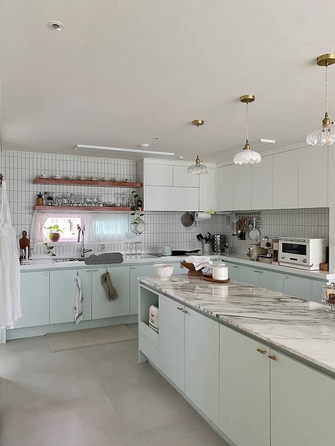 저희 집 민트 주방입니다 :) 30평대인데도 대형 아일랜드 테이블이 주방 가운데 길게 놓여 있어요.