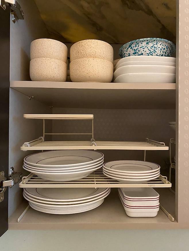 이 선반 덕분에 저희 집 유일한 4인 풀세트인 알코록 라인 접시들도 한 공간에 정리할 수 있었고 같은 사이즈들끼리 나누어 수납했더니 뒤적거리지 않고 필요한 접시만 딱딱 꺼내어 사용이 가능해졌어요.