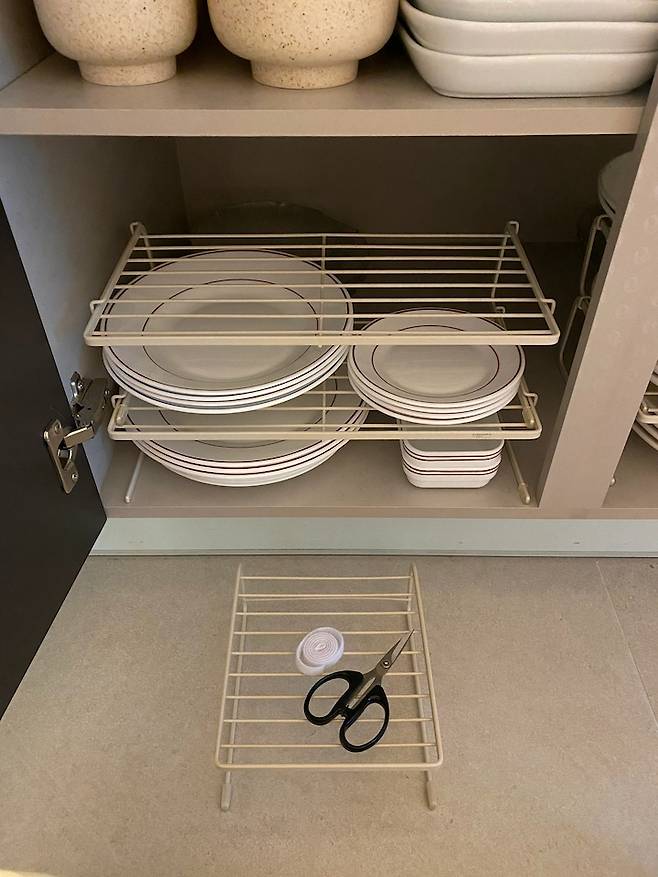 왼쪽 칸은 3P 짜리 정리대로 접시 사이즈별, 디자인별로 수납 중이에요.