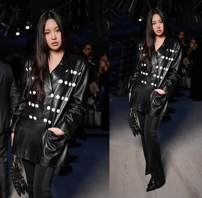 지난 5일(현지시간) 개최된 루이비통(Louis Vuitton) 2024 F/W 패션쇼에 혜인은 큼지막하 화이트 버튼이 눈에 띄는 시크한 블랙 가죽 수트룩으로 나이답지 않는 성숙미를 발산했다.