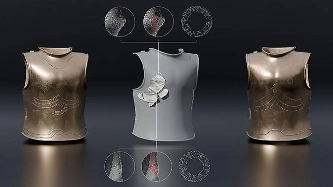 조사 관계자는 "구겨지고 녹이 슨 청동 조각은 약 3200년 전 전사들이 착용한 갑옷의 일부로 파악됐다"며 "물결과 태양 등 화려한 장식이 들어간 조각들을 잘 펴고 2년간 연구한 끝에 온전한 갑옷을 입체 모델로 재구성할 수 있었다"고 설명했다.