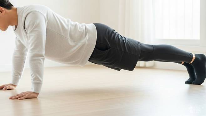 이후 복부에 힘을 주고 몸이 무너지지 않도록 유지하며, 손을 번갈아 짚어 제자리로 돌아온다. 이 과정을 5회 반복하며, 허리와 어깨, 손목에 과도한 부담이 가지 않도록 한다.