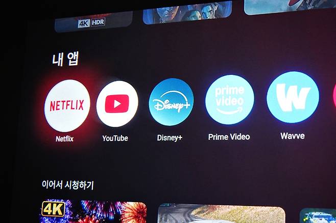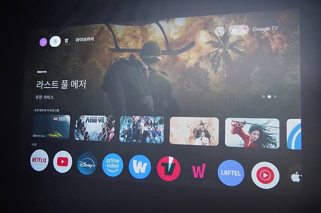 또 다른 장점으로는 구글빔프로젝터라서 넷플릭스를 비롯해 유튜브, 디즈니+, 프라임 비디오, 티빙 등 다양한 OTT 서비스를 별도의 외부 기기 없이 이용할 수 있습니다.