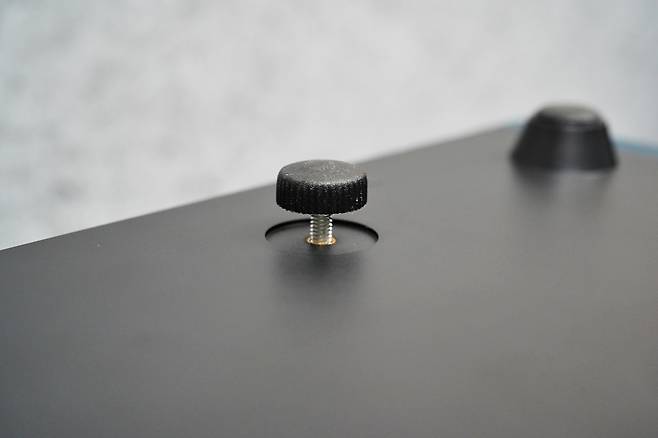 바닥면에는 다양한 마운트에 연결할 수 있는 나사홀이 있고 바닥에 두고 사용했을 때 상하로 각도조절을 살짝 할 수 있는 나사형 다리도 전방에 하나 배치되어 있습니다.