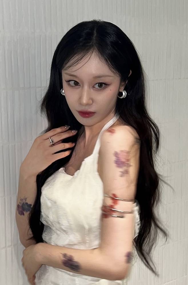 공개된 사진 속 지연은 화이트 원피스를 입고 손부터 등까지 이어지는 신체 곳곳에 꽃무늬의 타투를 그려넣은 모습을 뽐내고 있다.