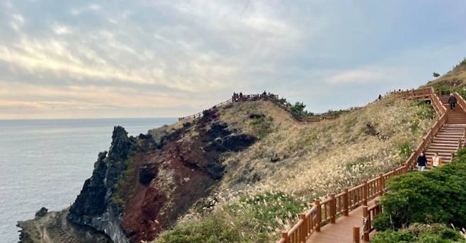 9월 현재는 여름의 짙은 녹음에서 가을로 넘어가는 과도기로, 푸른 바다와 초록빛 풀밭이 어우러진 시원한 풍경을 만날 수 있어요. 가을이 깊어지면 억새와 들꽃이 만발한 가을 정취를, 겨울에는 한라산까지 보이는 탁 트인 시원한 전망을 감상할 수 있답니다.
