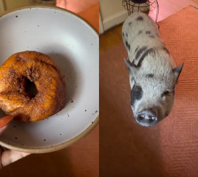 주인이 어디선가 맛있는 도넛을 가지고 옵니다. 그의 앞에 한 마리 돼지가 그 도넛을 보며 돌아!를 하고 있습니다. 이 돼지는 주인의 기대를 한 몸에 받으며, 단순한 간식이 아닌 도넛을 얻기 위해 두 번의 회전을 성공적으로 마쳤습니다.
