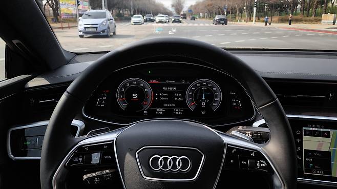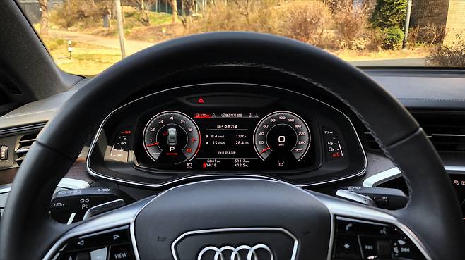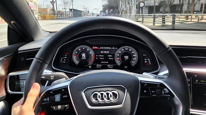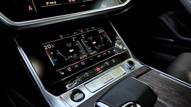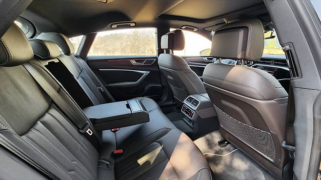A7의 인테리어는 디지털 감성이 풍부했다. 12.3인치 크기의 버추얼 콕피트 플러스와 MMI 디스플레이, 그리고 공조장치까지 터치 패널을 활용한다. 개인적으로 매립형 디지털 클러스터의 시인성이 참 마음에 든다. 스티어링 휠의 디자인이나 조작성도 훌륭하다. 또한 터치 장비는 직관성이 떨어질 수 있다는 점을 감안하여 햅틱 반응을 지원한다. 대시 패널은 블랙 하이그로시와 알루미늄 라인 등으로 미래지향적인 분위기를 연출하는데, 무드램프나 우드 트림, 가죽 기어노브 등 고급스러움을 자극하는 소재나 마감 품질도 훌륭했다.