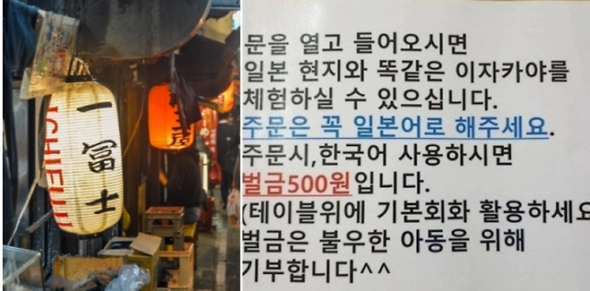 가게에 들어서면 점원들은 귀청이 떨어져라 ‘이럇사이마셰(어서오세요)’를 외칩니다. 메뉴판을 펼치면 어묵탕이 아닌 ‘오뎅탕’, 회 대신 ‘사시미’, 정종이 아닌 ‘사케’가 자리합니다. 기본안주 대신 ‘스키다시’, 일식 코스요리를 가리키는 ‘오마카세’, 튀김 덮밥인 ‘텐동’ 등의 일본어가 난무합니다. 곳곳에 짙게 물든 왜색으로 이곳이 일본인지 한국인지 헷갈릴 정도입니다.