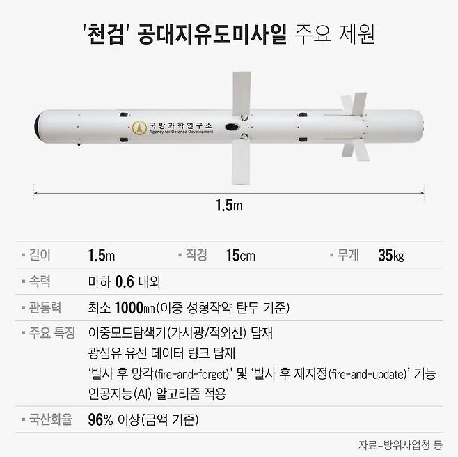 천검은 한국형 공대지 유도탄으로, 적의 지상 목표를 정밀 타격하는 데 사용됩니다. 뛰어난 사거리와 정확도를 자랑하며, 다양한 표적에 대응할 수 있도록 개발되었습니다. 주요 특징은 다음과 같습니다.