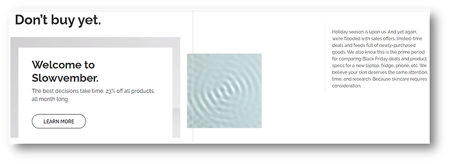 사진에 우측 상단의 문구를 보면 “(지금 업계에는) 홀리데이 시즌(블랙 프라이데이)이 다가와서 프로모션들이 가득하다.” “우리는 지금이 블랙 프라이데이 딜과 새 노트북, 냉장고, 휴대폰 등의 제품 사양을 비교할 수 있는 가장 좋은 시기라는 것을 알고 있다.” “당신의 피부도 동일한 관심, 시간 투자를 할 가치가 있다고 믿는다.”라고 적혀있어. 그러면서 우리는 다른 곳과 다르게 모든 제품에 11월 내내 23%의 할인을 해주는 ‘Slowvember’ 캠페인을 한다고 적혀있지.