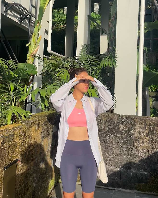 허가윤은 밝은 핑크색 스포츠 브라톱과 네이비 바이커 쇼츠, 화이트 셔츠를 매치해 건강미 넘치는 애슬레저 룩을 연출하고 있다. 여기에 에코백을 더해 실용성과 스타일을 동시에 잡았으며, 자연광 아래에서 활동적인 이미지를 강조했다.