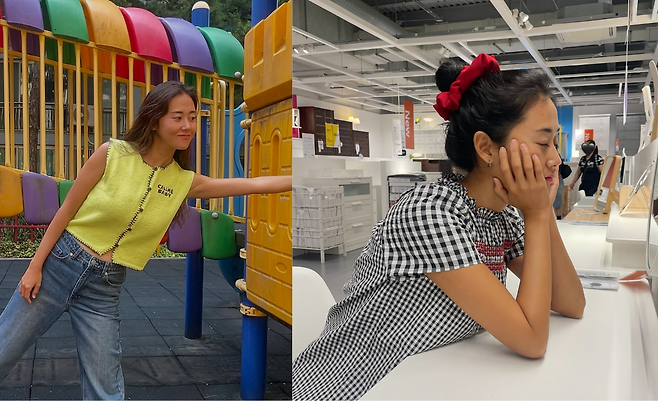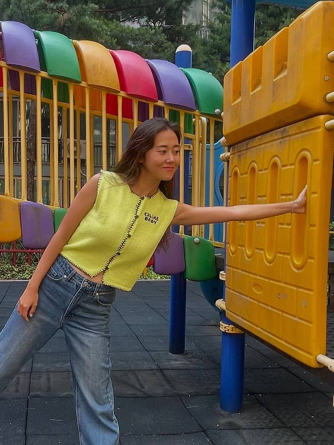 세 번째 사진에서 허가윤은 옐로 니트 베스트와 루즈핏 데님 팬츠를 매치해 레트로 무드의 캐주얼룩을 선보이고 있다. 베스트의 블랙 스티치 디테일과 프린트가 포인트가 되며, 컬러풀한 놀이터 배경과 조화를 이루며 발랄한 이미지를 강조한다.