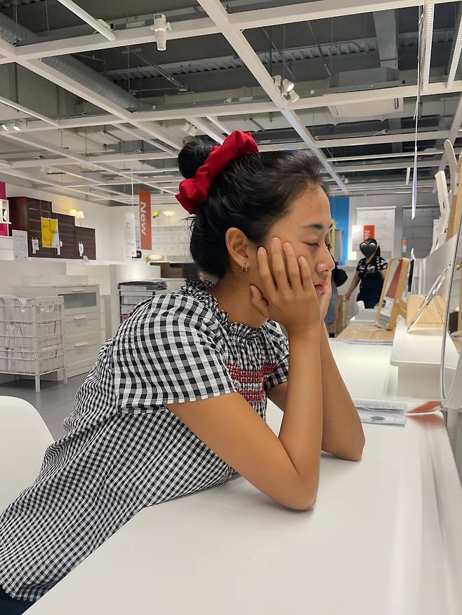 마지막 사진에서는 블랙&화이트 체크 블라우스와 레드 스크런치를 활용해 사랑스러운 무드를 연출하고 있다. 블라우스의 셔링 디테일과 체크 패턴이 경쾌함을 더하며, 헤어 액세서리로 포인트를 주어 전체적으로 산뜻한 이미지를 완성했다.