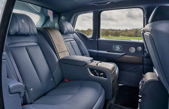 실내에 사용된 블랙우드 베니어는 플리트 블루를 주 색상으로 셀비 그레이와 검정 가죽이 조화를 이루는 3색 인테리어 팔레트와 절묘하게 어우러집니다. 시트 파이핑은 플리트 블루, 좌석 헤드레스트의 자수와 스티치는 셀비 그레이 색상으로 마감되었으며, 데이지가 새겨진 비스포크 일루미네이티드 트레드플레이트를 탑재해 인테리어의 완성도를 높였습니다. 또한, 차량 뒷좌석 코치 도어에 수납된 비스포크 우산 내부에도 데이지 모티프를 새겨 전체적인 통일감을 부여했습니다. 이 패턴은 우산을 펼쳤을 때 내부에서만 보이도록 설계되어 비 오는 날 데이지 꽃이 만개한 들판에 선 듯한 감성을 전달합니다.