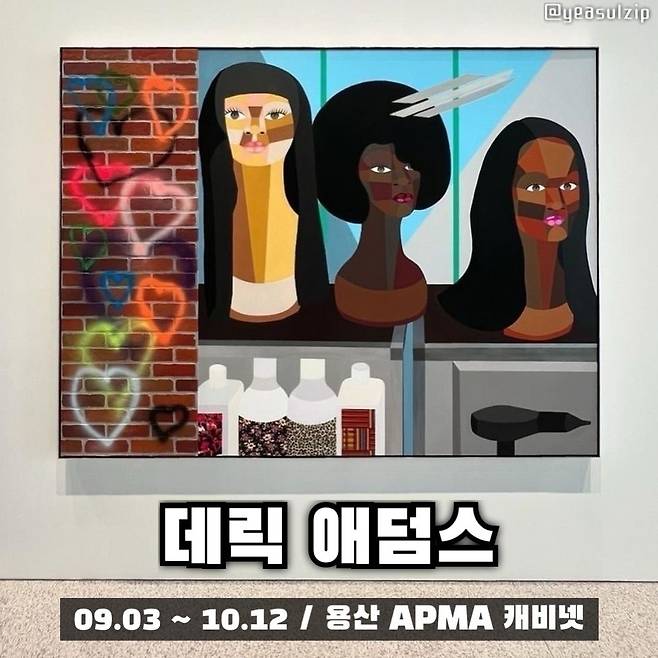 세계적인 갤러리 가고시안(Gagosian)이 서울 첫 단독 전시회를 개최한다. 데릭 애덤스는 한국에서의 첫 개인전을 위해 자신의 브루클린 스튜디오 근처, 그리고 전 세계 위치한 뷰티 매장의 쇼윈도 디스플레이에서 영감을 받은 새로운 회화 시리즈를 제작하였다. 작품 속에는 다채로운 가발을 쓴 여러 얼굴의 마네킹 두상들이 등장하며, 페인트 층과 그래피티, 도시의 흔적이 새겨진 부조 형태의 벽돌이 캔버스를 프레임처럼 두르고 있다. 더불어 표지판, 인도, 차량, 도로 등이 유리창에 반사된 모습이 더해져 내부와 외부 공간이 뒤섞인 듯한 시각적 효과를 자아낸다.
