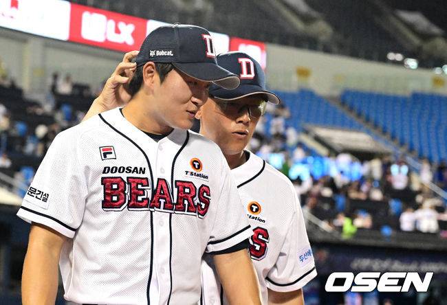 경기를 마치고 두산 김택연이 박정배 코치와 이야기를 나누고 있다. 2024.07.23 / jpnews@osen.co.kr