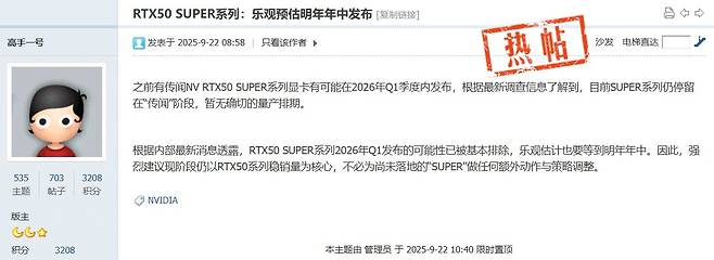 중국 IT 관련 커뮤니티인 ChannelGate에 한 유저가 제조사(AIB) 소식을 인용해 게시물을 올렸습니다. 내용을 보면 AIB 관계자들은 RTX 50 슈퍼의 2026년 1분기 출시 가능성을 거의 배제했다는 겁니다. 구체적인 출시 시기와 양산 일정이 아직 확정되지 않은 상황이며, 출시한다면 2분기 이후인 2026년 중반 정도로 예상한다네요.