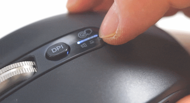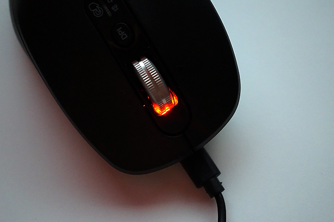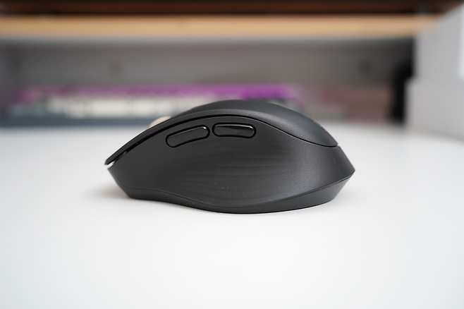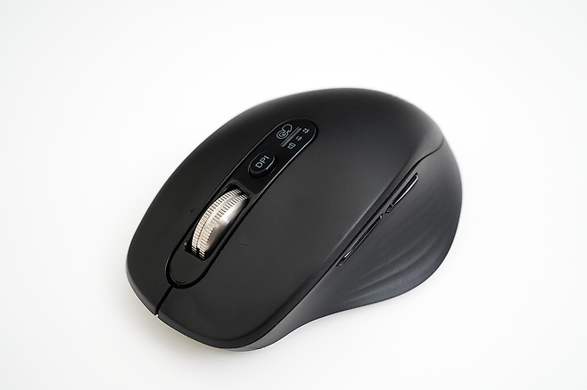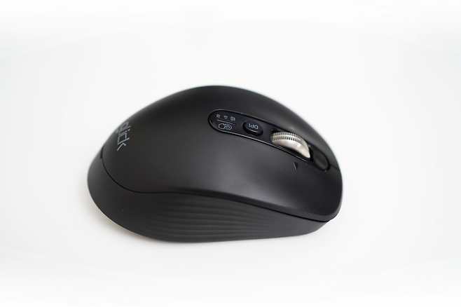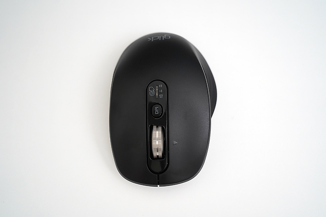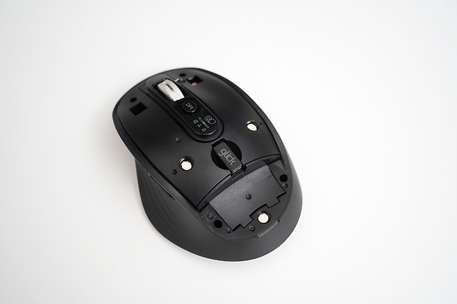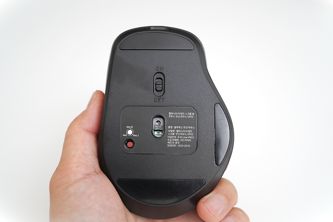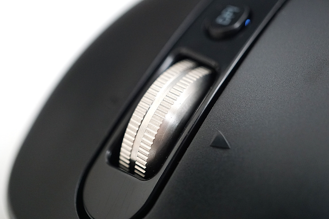오른손잡이 전용에 둥그스런 형태의 디자인으로 상단부의 버튼이 일체형 타입으로 구성되어 있습니다. 상단부에는 DPI 전환 버튼과 연결 모드상태를 알려주는 인디게이터가 위치해 있습니다. DPI 뒷쪽에는 모드 전환 버튼이 있어 2.4GHz 동글과 블루투스 1,2연결을 자유롭게 페어링 하며 사용이 가능합니다.