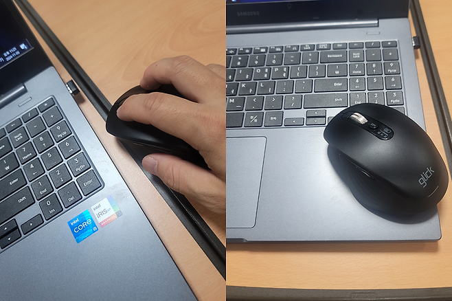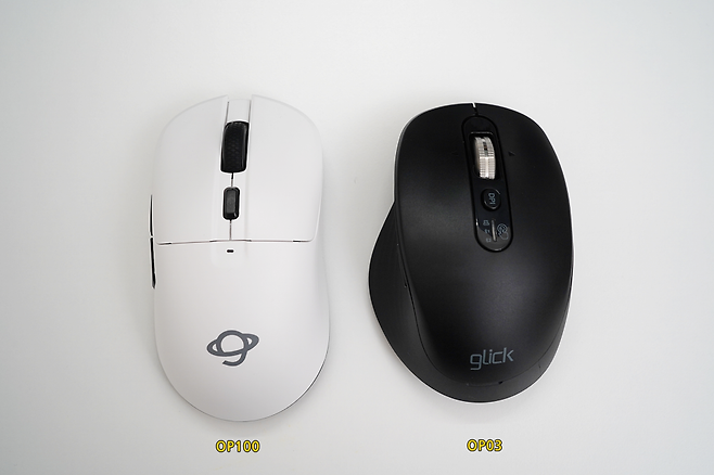 지클릭커의 게이밍 전용 마우스 OP100과의 투샷입니다. 휴대용/사무용 디자인이라 좌우로 더 넓고 위아래는 짧은 모습입니다.