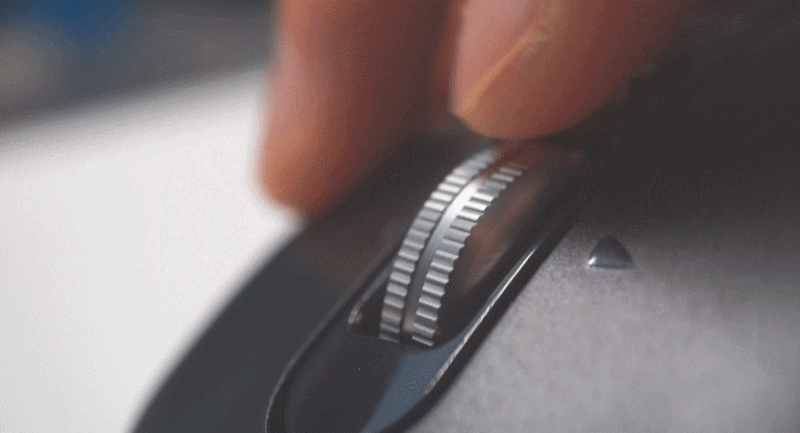 잘 가공된 금속 재질의 휠입니다. 살살 돌릴 때에는 구분감 있는 움직임이며 크게 힘을 줄 때에는 계속적으로 돌아가는 무한휠 모드로 작동하게 됩니다.