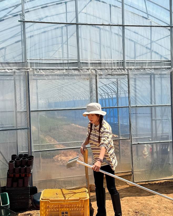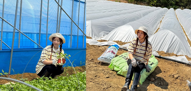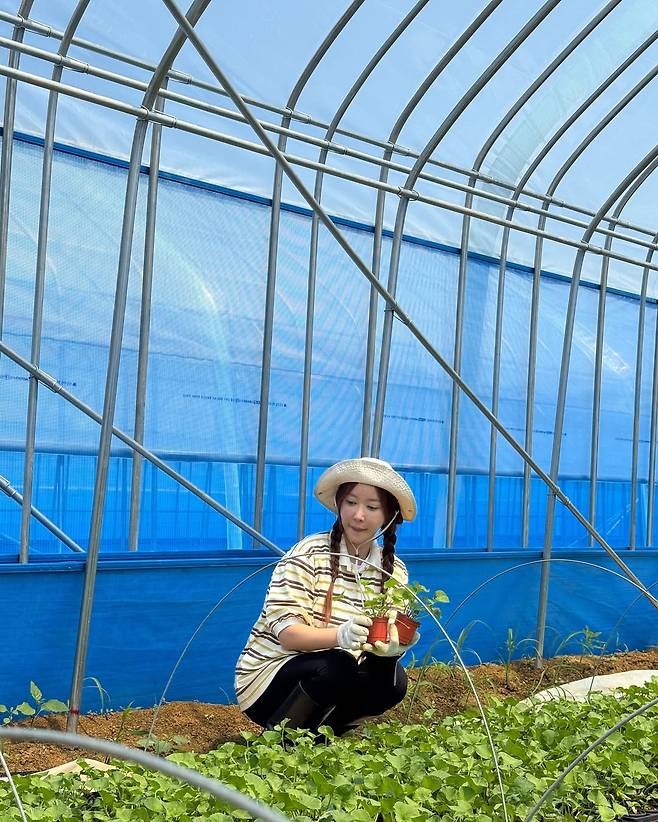 공개된 사진 속 슈는 비닐하우스 안에서 직접 키운 병풀 화분을 조심스럽게 들고 있는 모습이다.