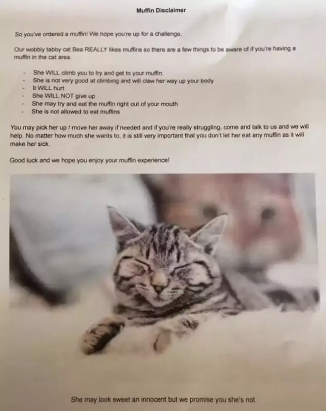 카페의 경고장에 따르면 베아는 머핀을 너무 좋아해 손님의 몸을 할퀴고 머핀을 입에서 낚아채곤 한다고 합니다.