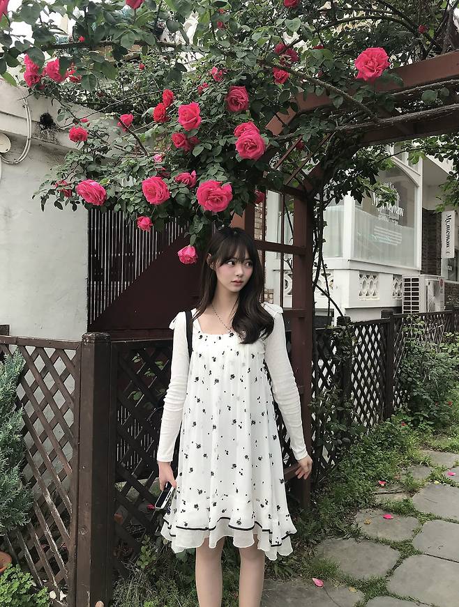 흰색 스퀘어 넥 티셔츠에 나시 원피스 형태의 플라워 프릴 스커트를 레이어드했어요.