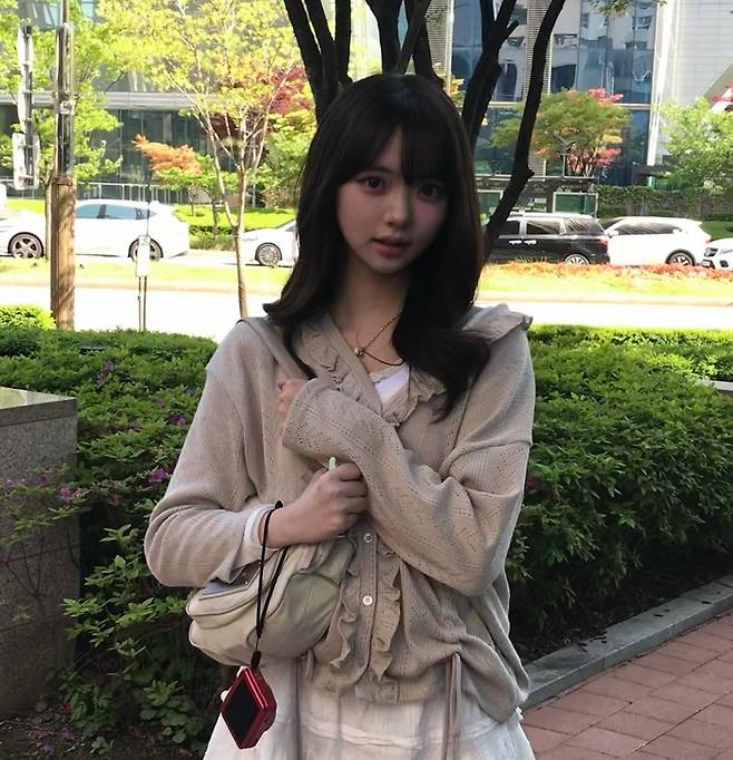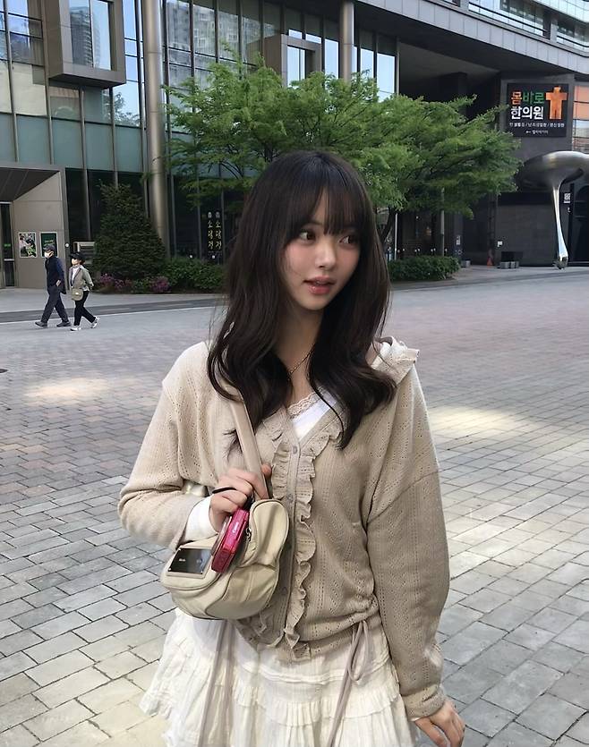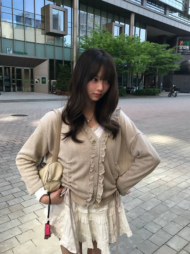 이번엔 프릴 니트 + 화이트 프릴 스커트의 ‘프릴 온 프릴’ 매치예요.