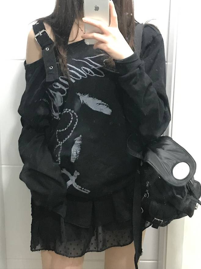 상의는 늘어진 느낌의 조금 어두운 색상의 니트이기 때문에