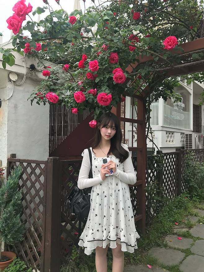 신발과 가방 같은 부속 코디는 꽃패턴 색상에 맞추어 검정으로 포인트를 주었는데요,