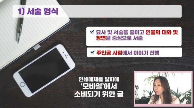 그럼 웹소설은 일반 기존의 소설과 어떤 게 다를까요? 원래 소설은 읽는 소설, 생각하는 소설이었으나 웹소설은 '보는 소설'로 생각하는 것이 맞습니다. 비주얼 스토리텔링이라고 하죠. 그래서 웹소설에서는 이야기를 시각적으로 전달하는 것이 아주 중요합니다. 술술 읽히는 가독성 역시 빼놓을 수 없는 부분 중에 하나이고요.