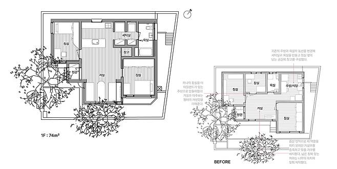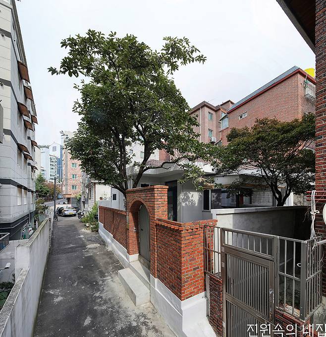 친구와 고양이까지, 세 식구가 함께 아파트에서 지내오던 건축주 조지영 씨는 문득 이제는 자리를 잡을 내 집을 마련해야겠다고 생각했다. 10년 넘게 거주해온 은평구였고, 동네의 특성을 잘 알아 물색에는 고민이 적었다. 이윽고 세월이 내려앉은 골목길에서 만난 구옥은 1년이 넘게 방치된, 1972년도에 지어진 단층주택이었다. 작은 마당을 가졌지만, 그 안의 설비들은 빈약했고 마당의 감나무로 인한 낙엽이 쌓여 이웃들의 불만이 큰 상황이었다.