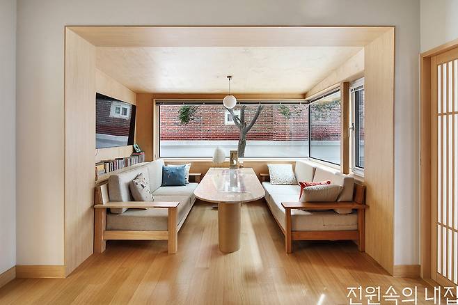 부족했던 거실 공간은 증축과 함께 온전한 형태로 집의 핵심 공간이 되었다. 정승환 소장은 아파트가 가진 평면 구조가 주택과 크게 다르지 않다고 여겼고, 거실과 주방을 일직선상에 둔 뒤 이를 방과 방을 향한 동선이 가로지르는 구조를 완성했다. 리모델링의 중요 포인트는 바로 거실의 창. 주변이 빌라들로 꽉 찬 필지에 맞게 채광을 확보하면서, 작지만 독립된 감나무집만의 마당을 온전히 느낄 수 있게 만들었다. 나무의 형태를 고려해 만든 투명 처마를 통해 계절의 빛이 들어찬다.