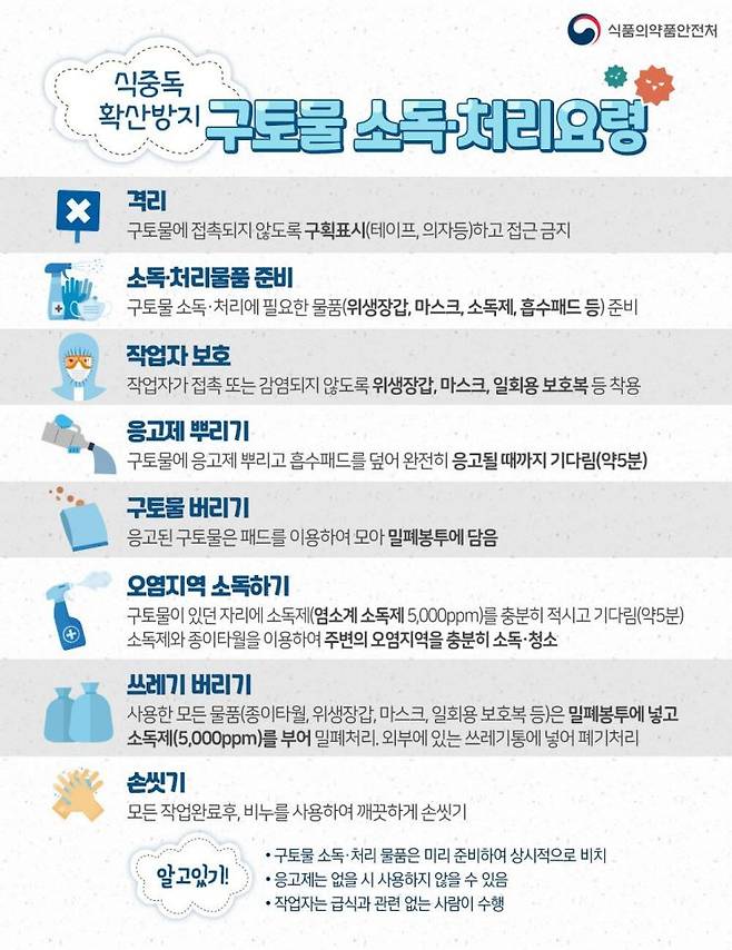 식중독 확산 방지 구토물 소독·처리 요령으로는 ▲구토물에 접촉되지 않도록 구획 표시하고 접근금지 ▲구토물 소독·처리에 필요한 물품 준비 ▲작업자가 접촉 또는 감염되지 않도록 위생장갑, 마스크, 일회용 보호복 등 착용 ▲구토물에 응고제 뿌리기 ▲구토물은 패드를 이용하여 밀폐 봉투에 담음 ▲구토물 있던 자리 소독하기(염소계 소독제 5000ppm) ▲사용한 모든 물품 밀폐 봉투에 넣고 소독제 부어 폐기처리 ▲모든 작업완료 후, 손 씻기 등이다.