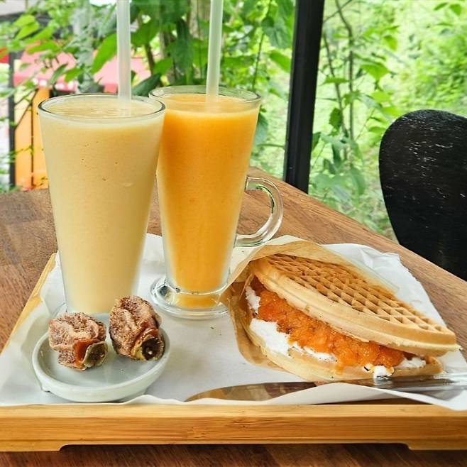 대아수목원 인근에 위치해 초록초록 싱그러운 자연을 눈에 담을 수 있는 홍시먹으러곶감이야. 주인장이 직접 농사지은 유기농 홍시로 만든 메뉴를 판매해. 특히 홍시 슬러시와 하얀 크림 위에 얼린 홍시가 듬뿍 채워진 와플은 세트로 구성되어 있으니, 달콤하고 시원한 조합을 즐겨봐.