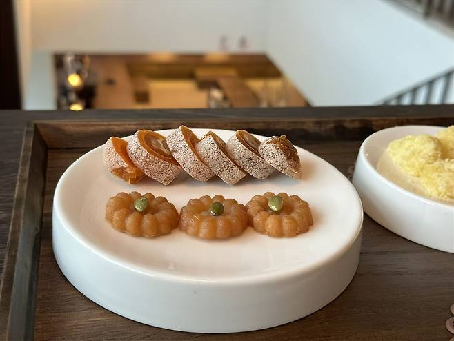 한옥 카페 꿈꾸니차는 경남 함안 특산품인 곶감을 사용해 디저트를 만들어. 시그니처 메뉴이자 가장 인기가 많은 건 호두 곶감 말이! 부드러운 크림치즈에 고소한 호두, 곶감의 달콤함과 쫀득한 식감이 더해져 맛이 없을 수 없는 조합이야.